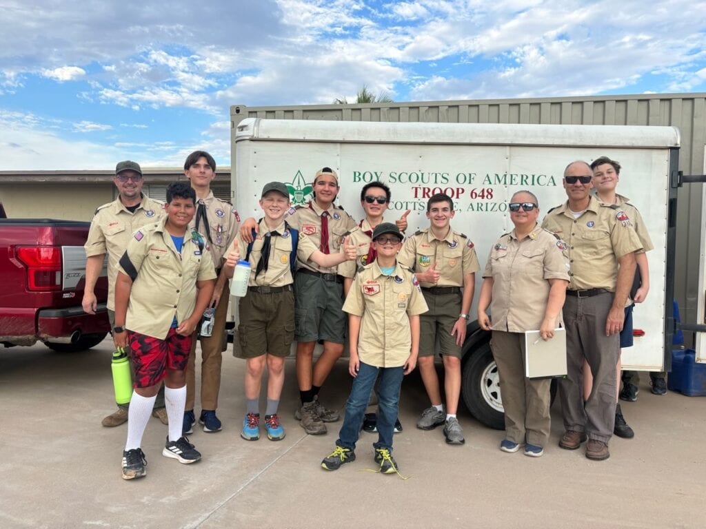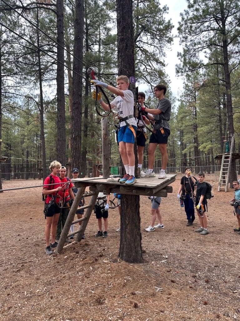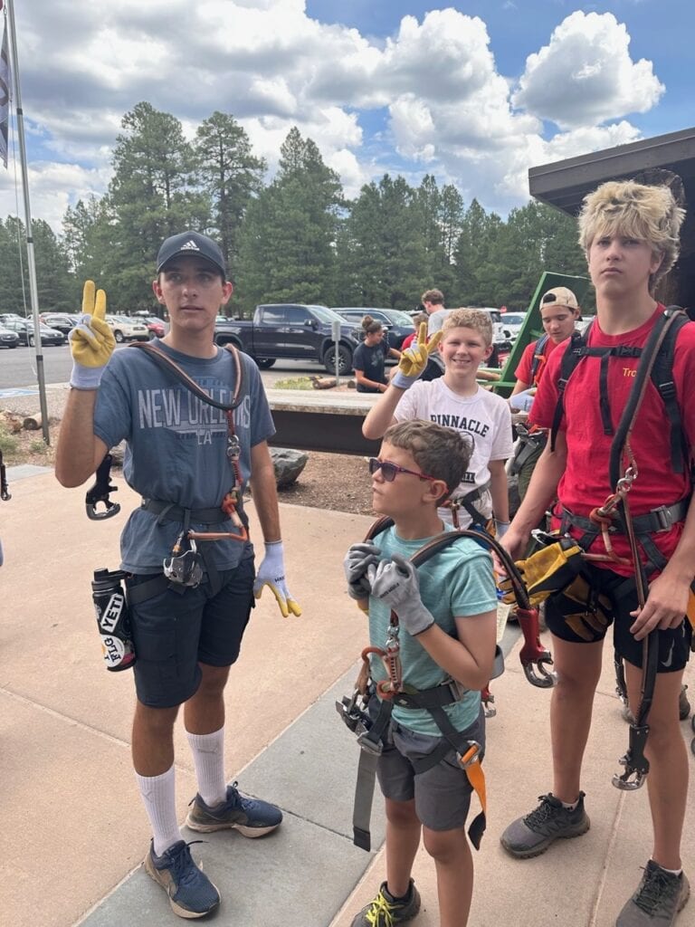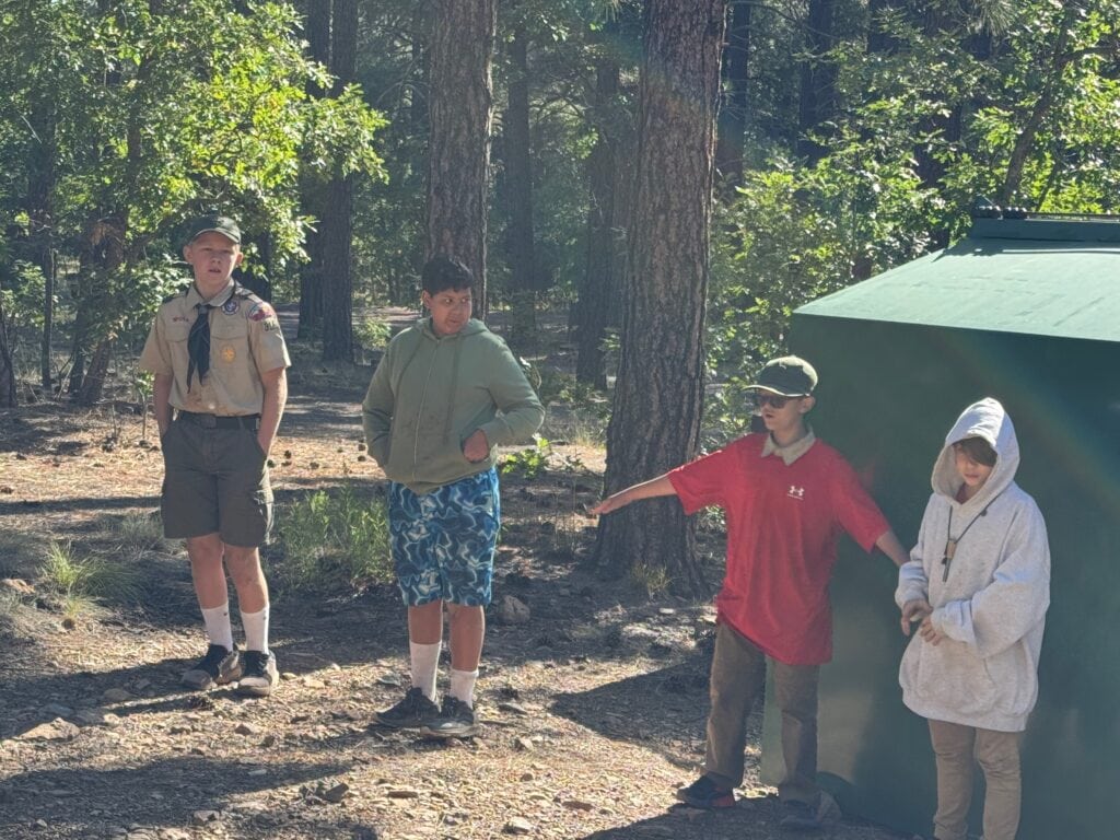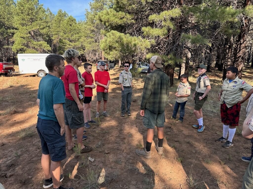 Six scouts and their adult leaders set out to backpack into the Fossil Springs Wilderness area at the confluence of the Tonto and Coconino National Forests. The trailhead starts out on Deadman Mesa west of Strawberry, and drops steeply down 1,500 feet into the Fossil Creek Canyon below over 4 miles of exposed switchbacks. Once in the canyon, however, the reward is access to another of Arizona’s spectacular riparian areas.